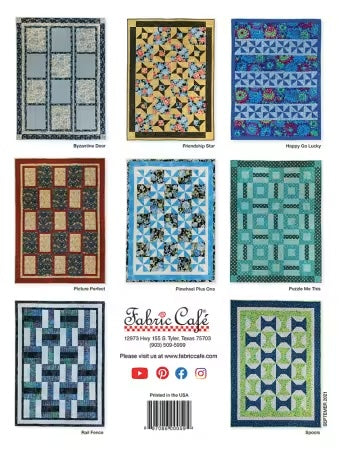 20 page book; 8 quilt designs written for 3 sizes- Lap, Twin and Queen/King. Easy to kit-3, 1-yard cuts make lap quilt kit. Twin uses 2 lap kits, Q/K uses 4 lap kits.